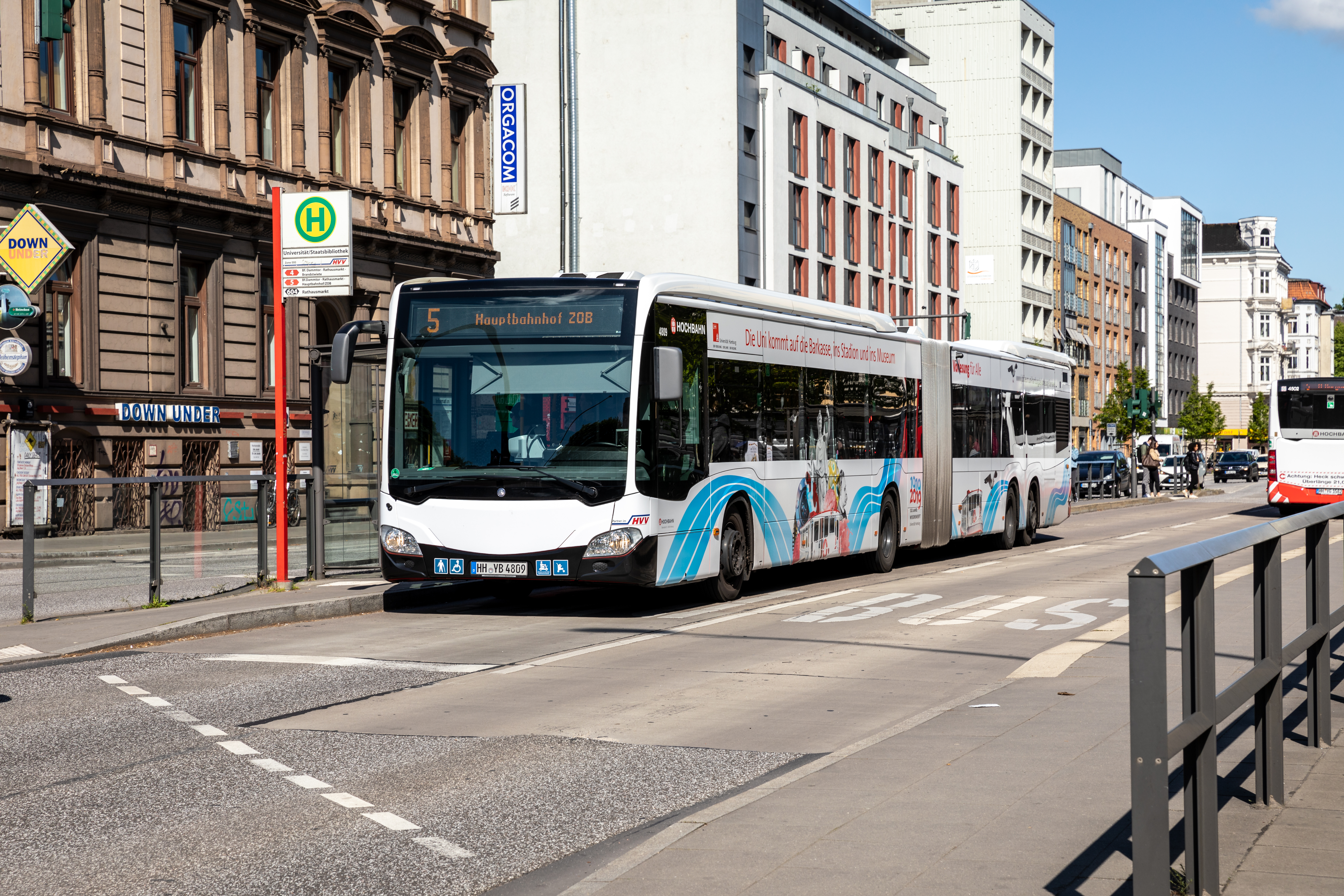Mehr als 60.000 Menschen nutzen täglich die Linie 5, die von der Hochbahn betrieben wird, und die eine der meistbefahrenen Strecken Europas ist. Der „Jubiläumsbus“ ist ein knapp 21 Meter langer XXL-Gelenkbus, der gelegentlich auch auf der Linie 4 fahren wird, die ebenfalls am Bahnhof Dammtor und im Grindelviertel hält. Seine Außenflächen ziert eine Collage aus Wissenschaftsmotiven, darunter eine Justitia-Statue, das Porträt Friedrich Nietzsches und eine Petrischale.