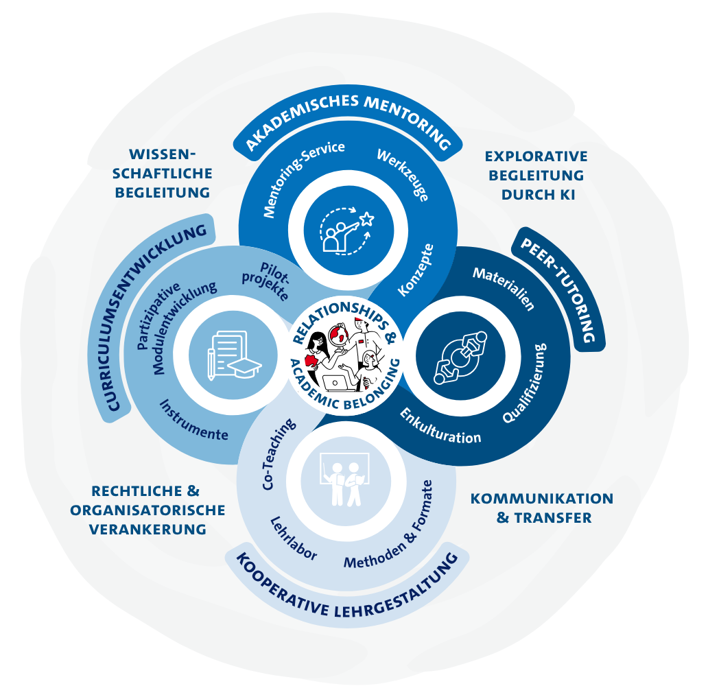 ReAction steht für: Relationships and Academic Belonging in Higher Education. Das Projekt deckt vier thematische Schwerpunkte ab, um die Qualität von Beziehungen in Studium und Lehre sowie die akademische Zugehörigkeit zu unterstützen – flankiert von querliegenden Schwerpunkten, die den Prozess begleiten und beim Aufbau von Strukturen helfen.